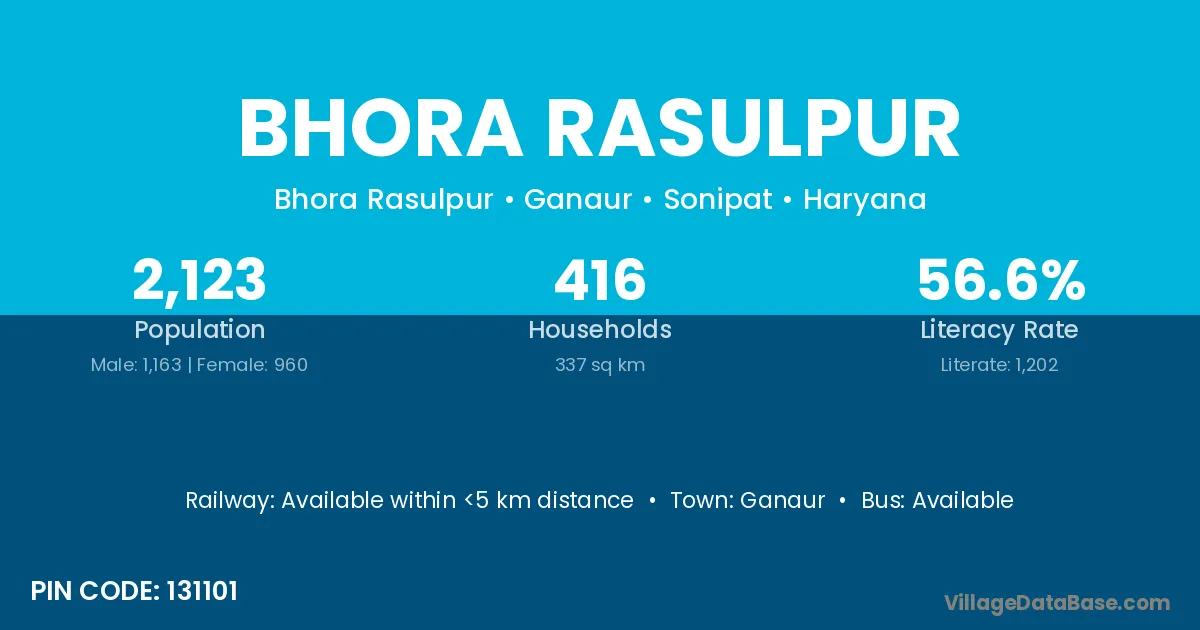 Bhora Rasulpur village has a total population of 2,123 people, of which 1,163 are males and 960 are females.