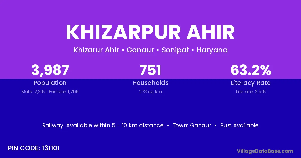 Khizarpur Ahir village has a total population of 3,987 people, of which 2,218 are males and 1,769 are females.