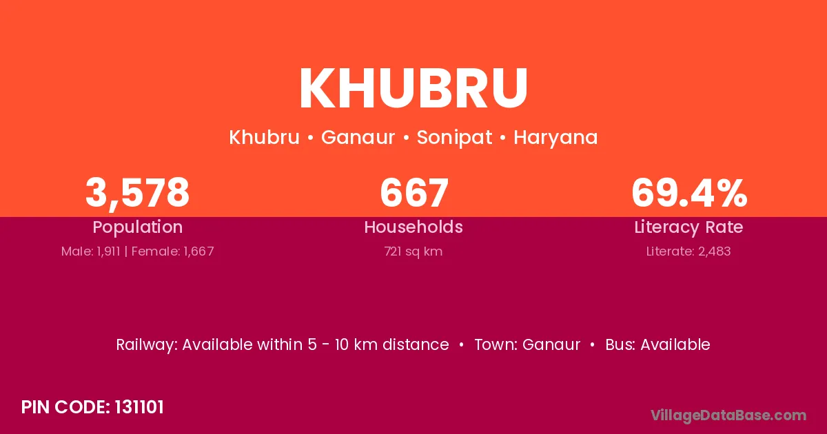 Khubru village has a total population of 3,578 people, of which 1,911 are males and 1,667 are females.