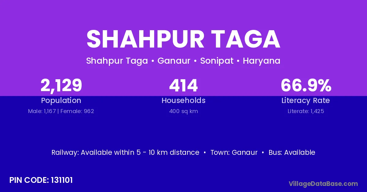 Shahpur Taga village has a total population of 2,129 people, of which 1,167 are males and 962 are females.