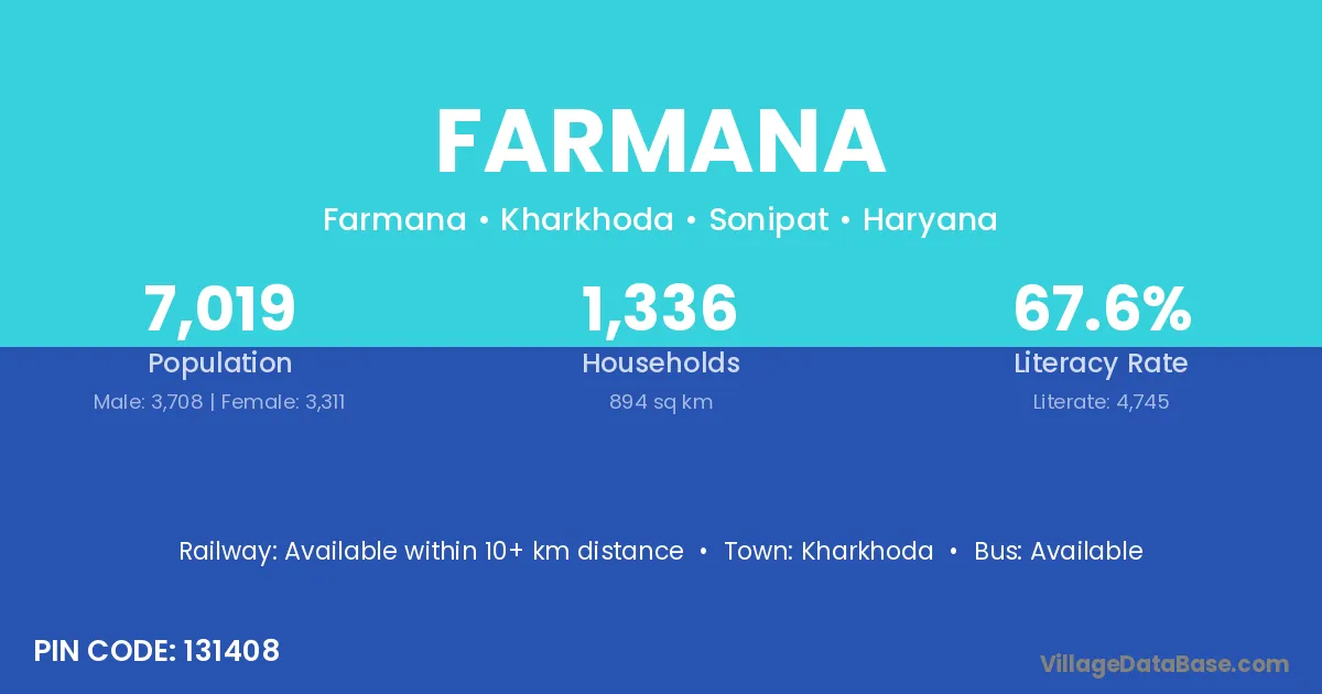 Farmana village has a total population of 7,019 people, of which 3,708 are males and 3,311 are females.
