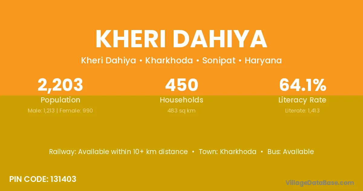 Kheri Dahiya village has a total population of 2,203 people, of which 1,213 are males and 990 are females.
