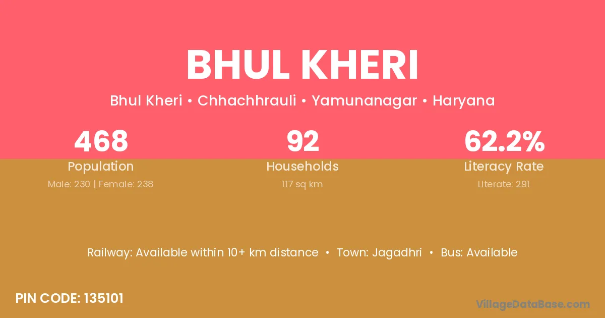 Bhul Kheri village has a total population of 468 people, of which 230 are males and 238 are females.