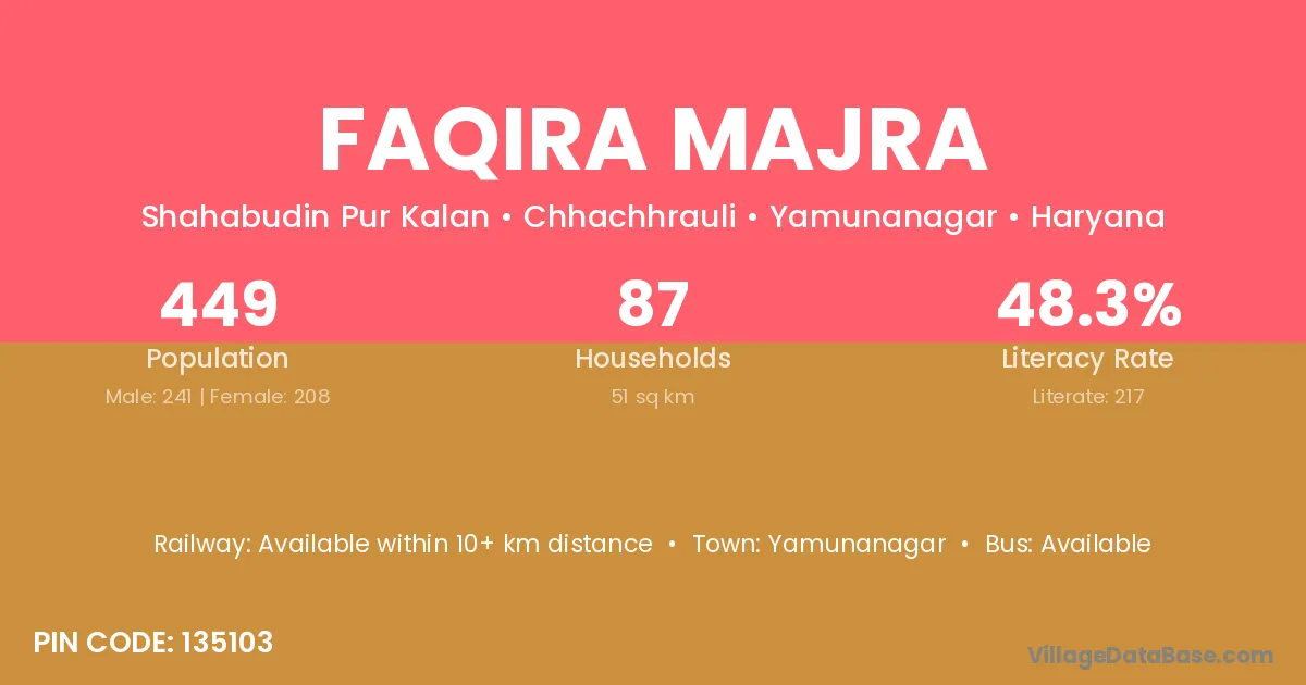 Faqira Majra village has a total population of 449 people, of which 241 are males and 208 are females.
