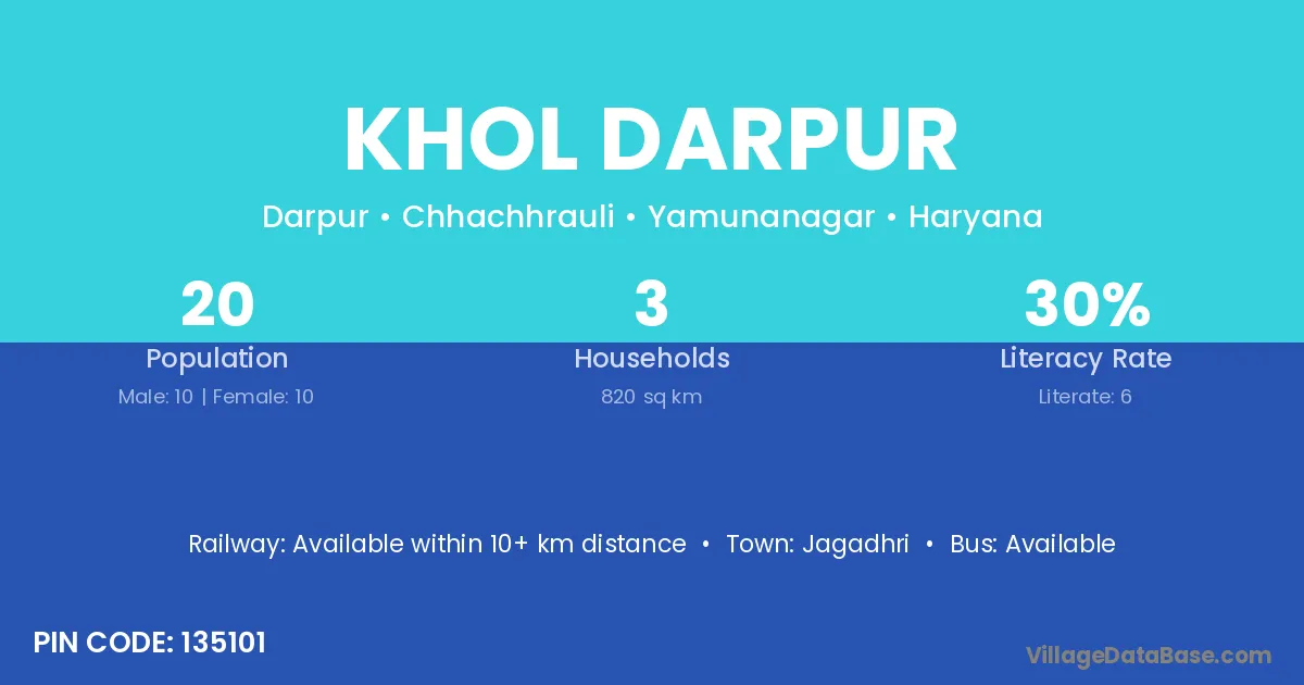 Khol Darpur village has a total population of 20 people, of which 10 are males and 10 are females.