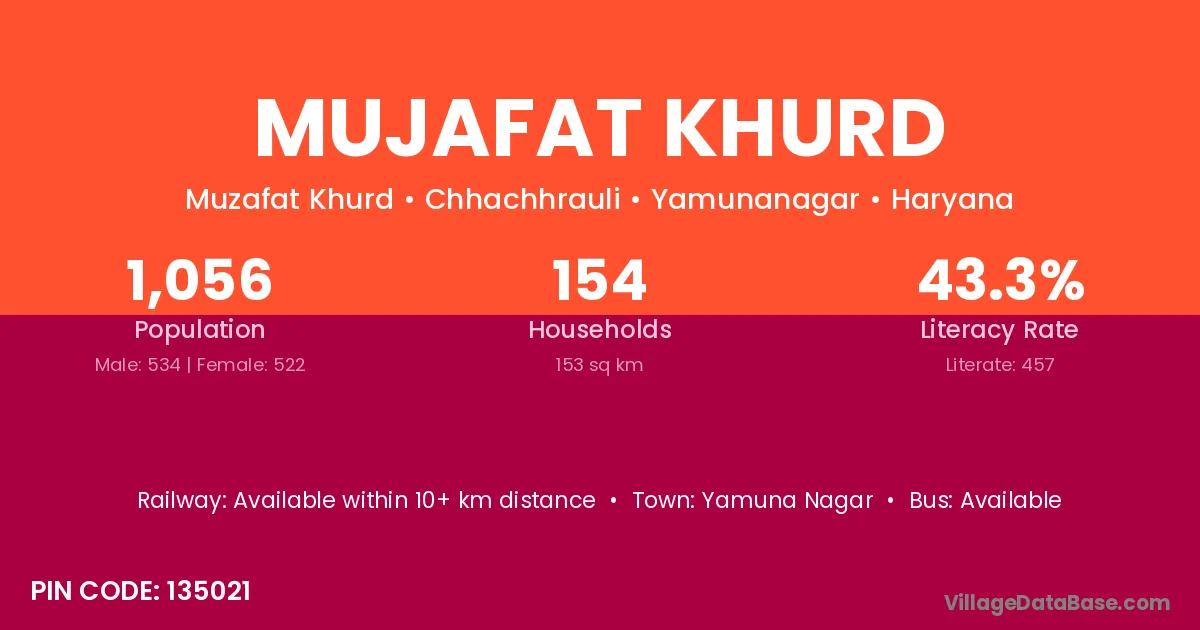 Mujafat Khurd village has a total population of 1,056 people, of which 534 are males and 522 are females.