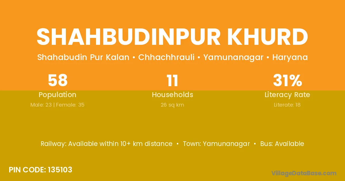 Shahbudinpur Khurd village has a total population of 58 people, of which 23 are males and 35 are females.