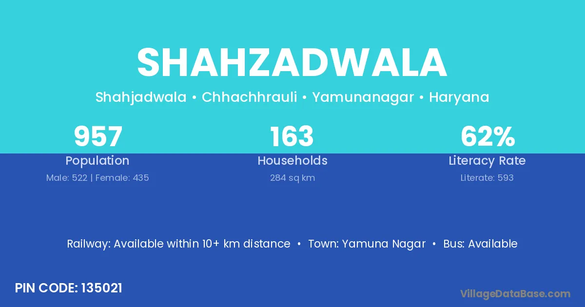 Shahzadwala village has a total population of 957 people, of which 522 are males and 435 are females.