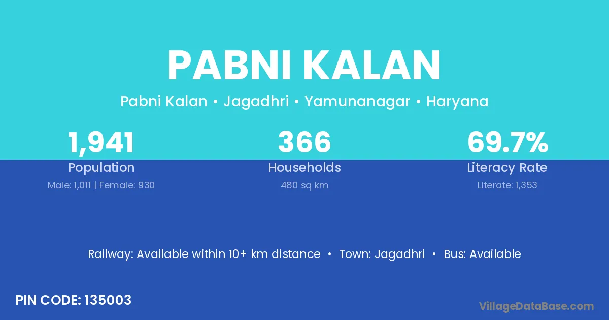 Pabni Kalan village has a total population of 1,941 people, of which 1,011 are males and 930 are females.