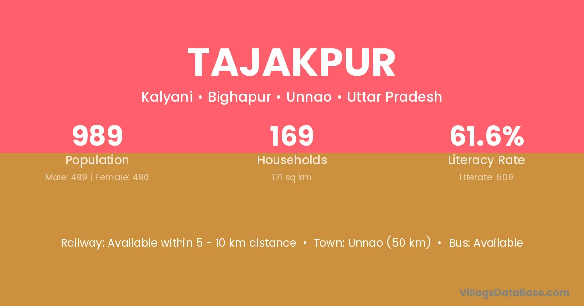 The literacy rate of Tajakpur village is 73.85%. Male literacy stands at 78.97% and female literacy at 68.04%.
