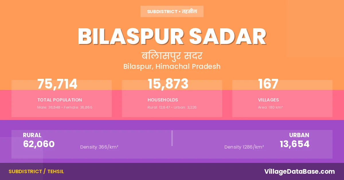 According to the 2011 census The total area of Bilaspur Sadar Tehsil is 180 km², with a population of 75714 people. The population density is 420 inhabitants per square kilometre, and there are approximately 15873 houses in the sub district.