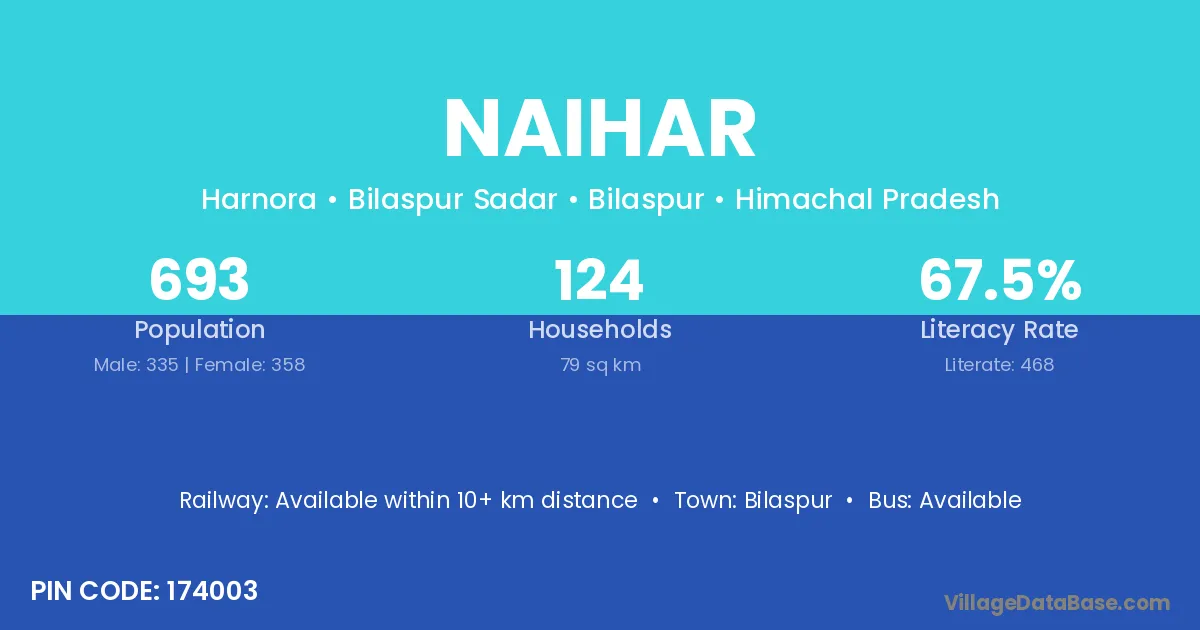 Naihar village has a total population of 693 people, of which 335 are males and 358 are females.