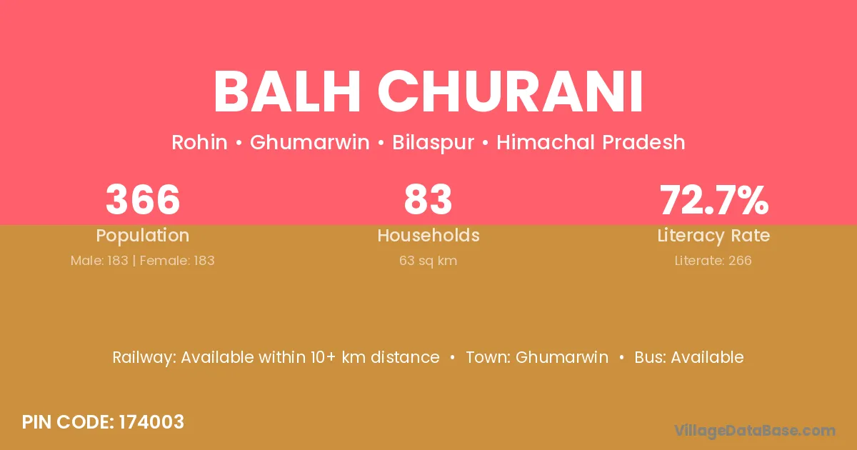 Balh Churani village has a total population of 366 people, of which 183 are males and 183 are females.