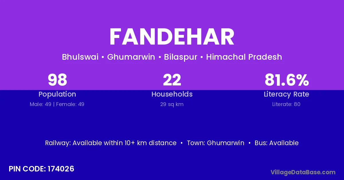 Fandehar village has a total population of 98 people, of which 49 are males and 49 are females.