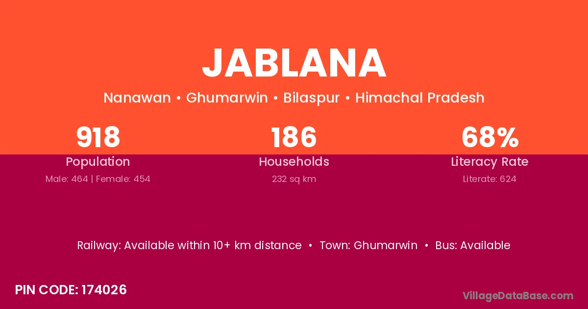 Jablana village has a total population of 918 people, of which 464 are males and 454 are females.