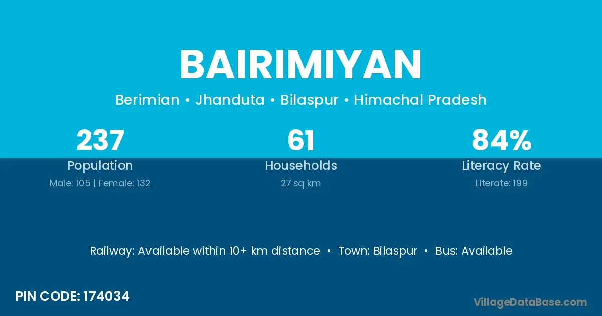 Bairimiyan village has a total population of 237 people, of which 105 are males and 132 are females.