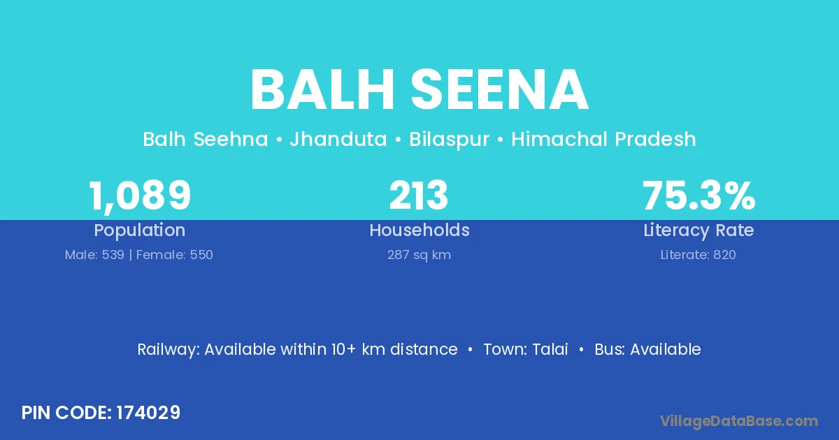 Balh Seena village has a total population of 1,089 people, of which 539 are males and 550 are females.