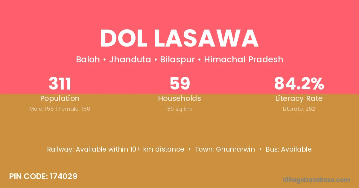 Dol Lasawa village has a total population of 311 people, of which 155 are males and 156 are females.