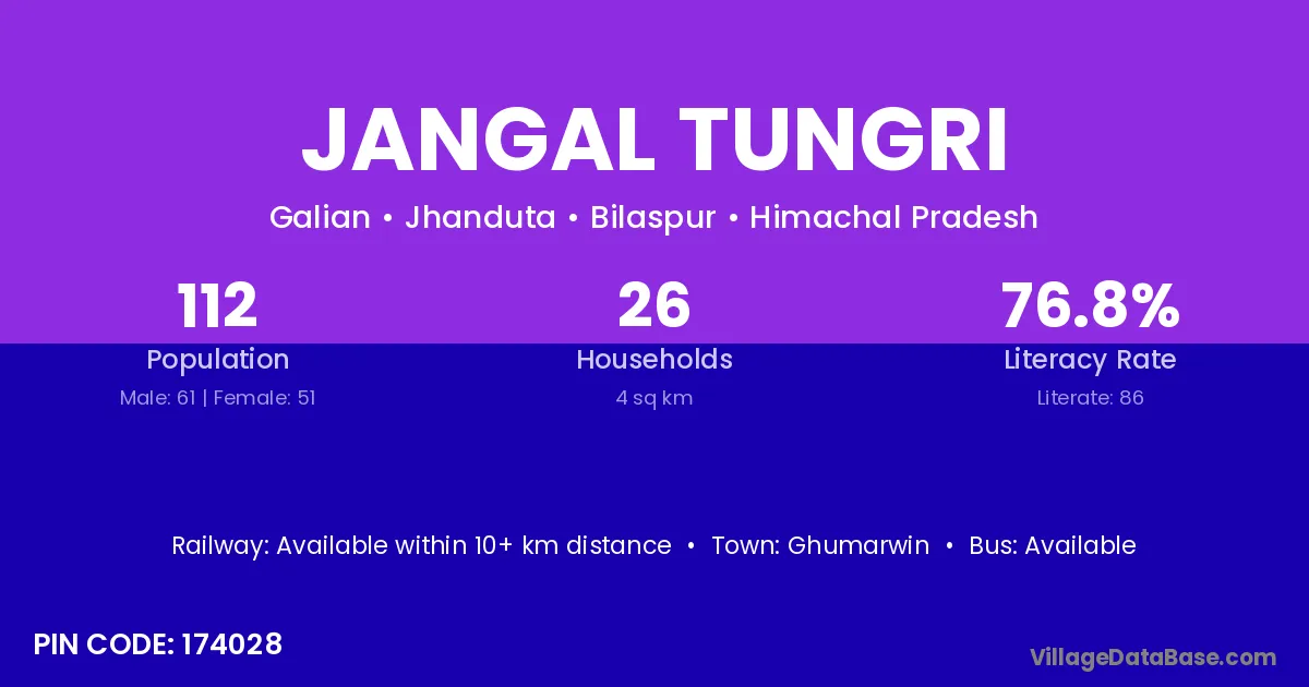 Jangal Tungri village has a total population of 112 people, of which 61 are males and 51 are females.