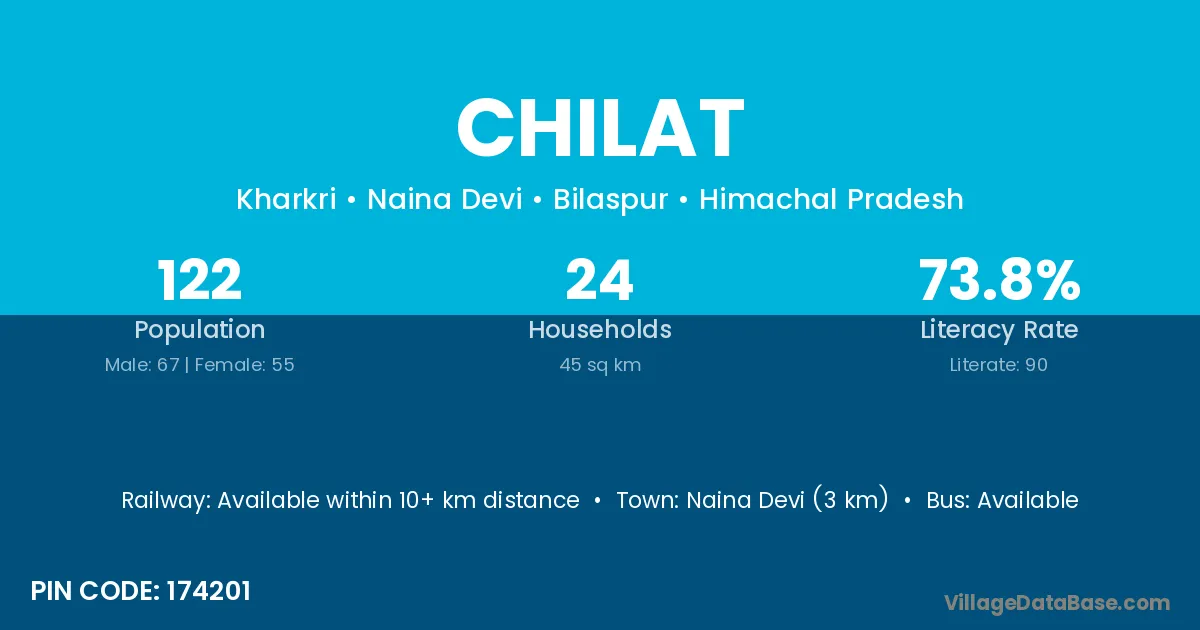 Chilat village has a total population of 122 people, of which 67 are males and 55 are females.