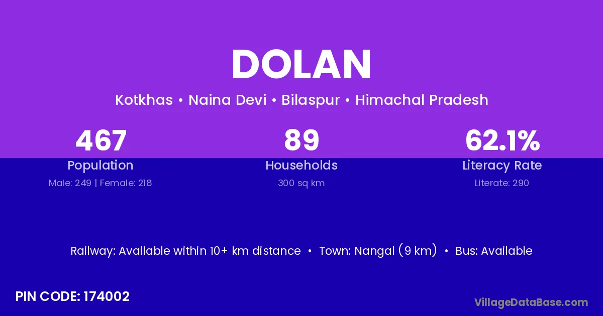 Nangal (9 km) is the nearest town to Dolan village for major economic activities and is located approximately 9 km away.