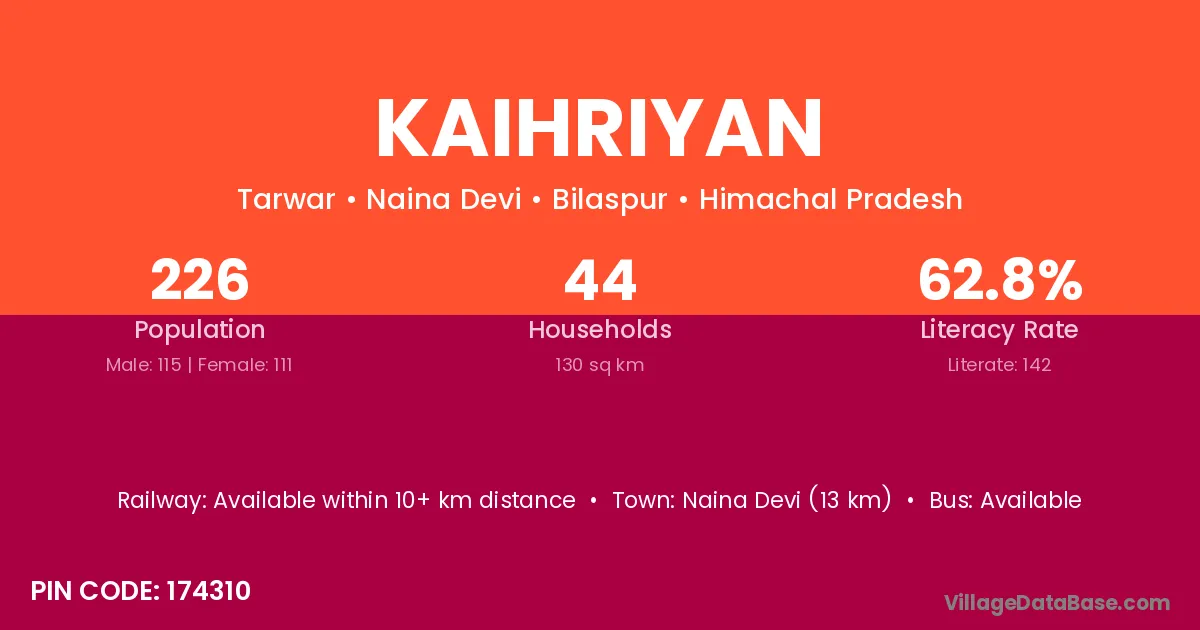Naina Devi (13 km) is the nearest town to Kaihriyan village for major economic activities and is located approximately 13 km away.