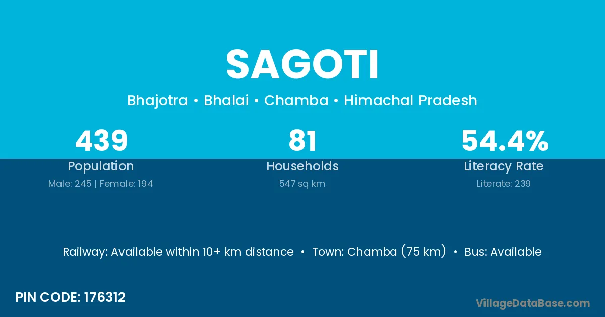 Chamba (75 km) is the nearest town to Sagoti village for major economic activities and is located approximately 75 km away.