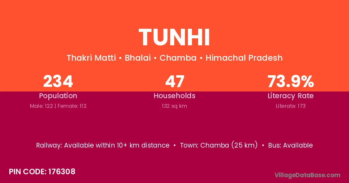 Chamba (25 km) is the nearest town to Tunhi village for major economic activities and is located approximately 25 km away.