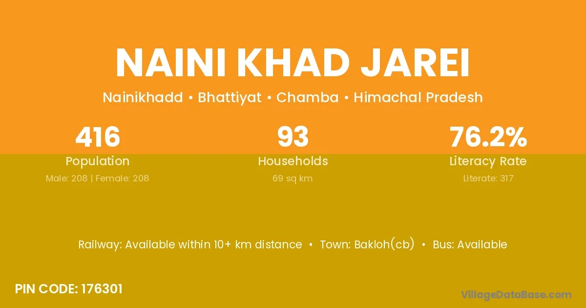 Naini Khad Jarei village has a total population of 416 people, of which 208 are males and 208 are females.