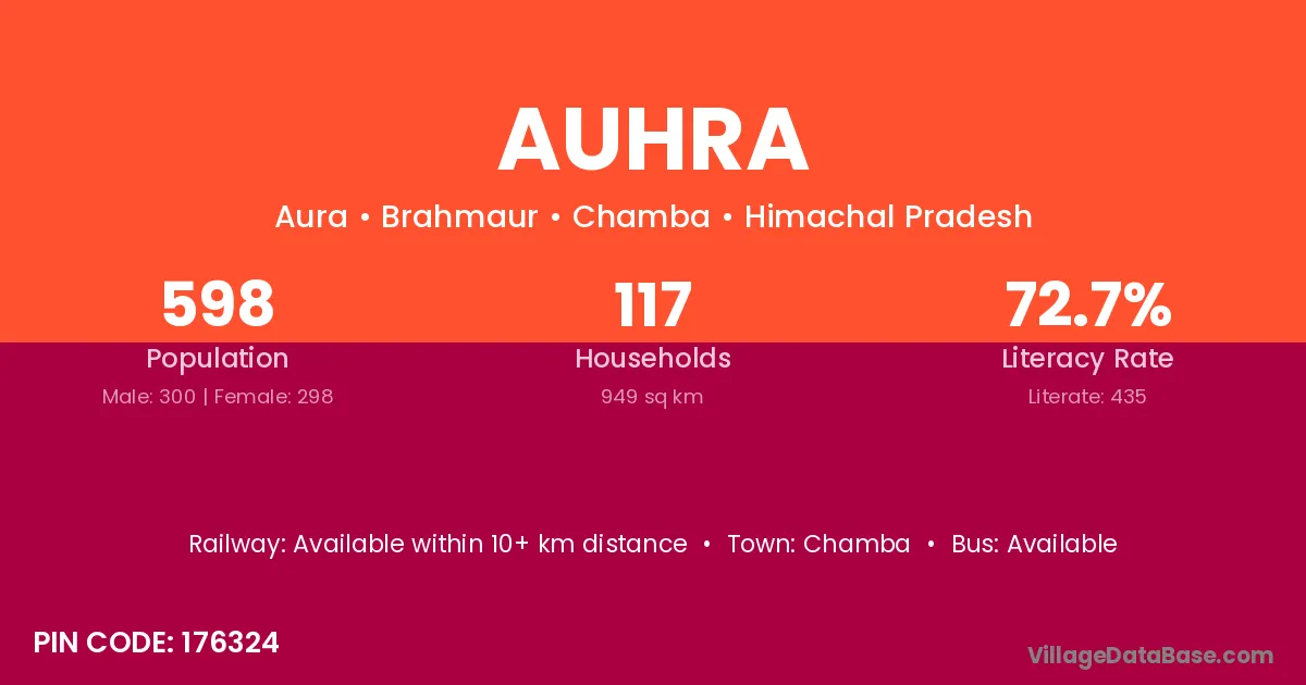 Auhra village has a total population of 598 people, of which 300 are males and 298 are females.