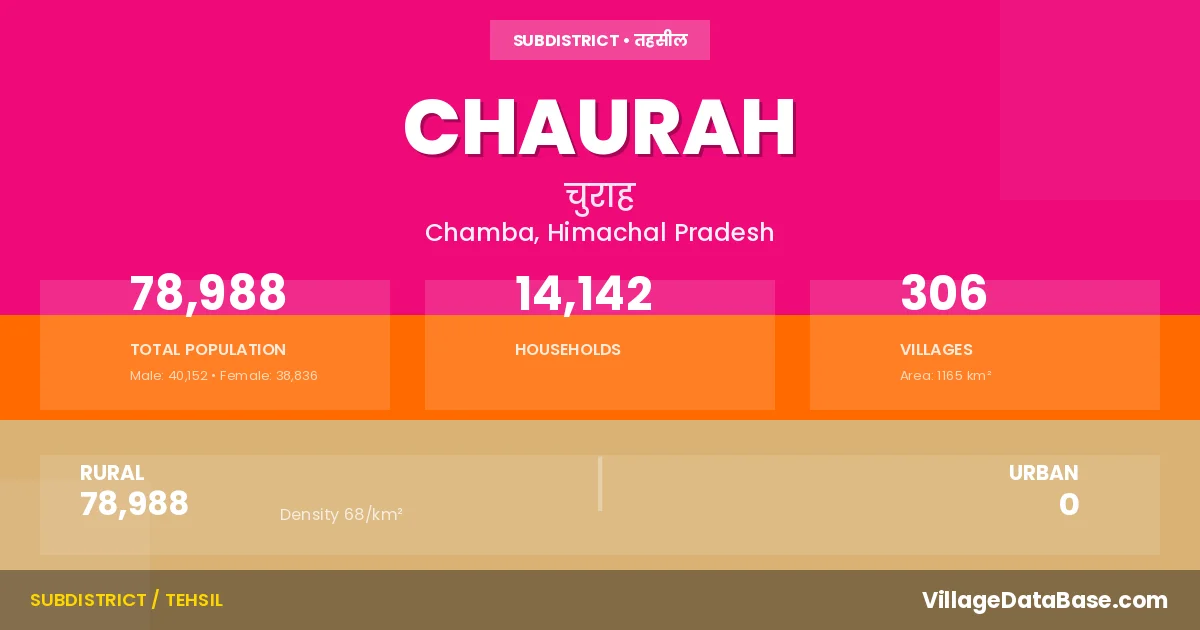 According to the 2011 census The total area of Chaurah Tehsil is 1165 km², with a population of 78988 people. The population density is 68 inhabitants per square kilometre, and there are approximately 14142 houses in the sub district.