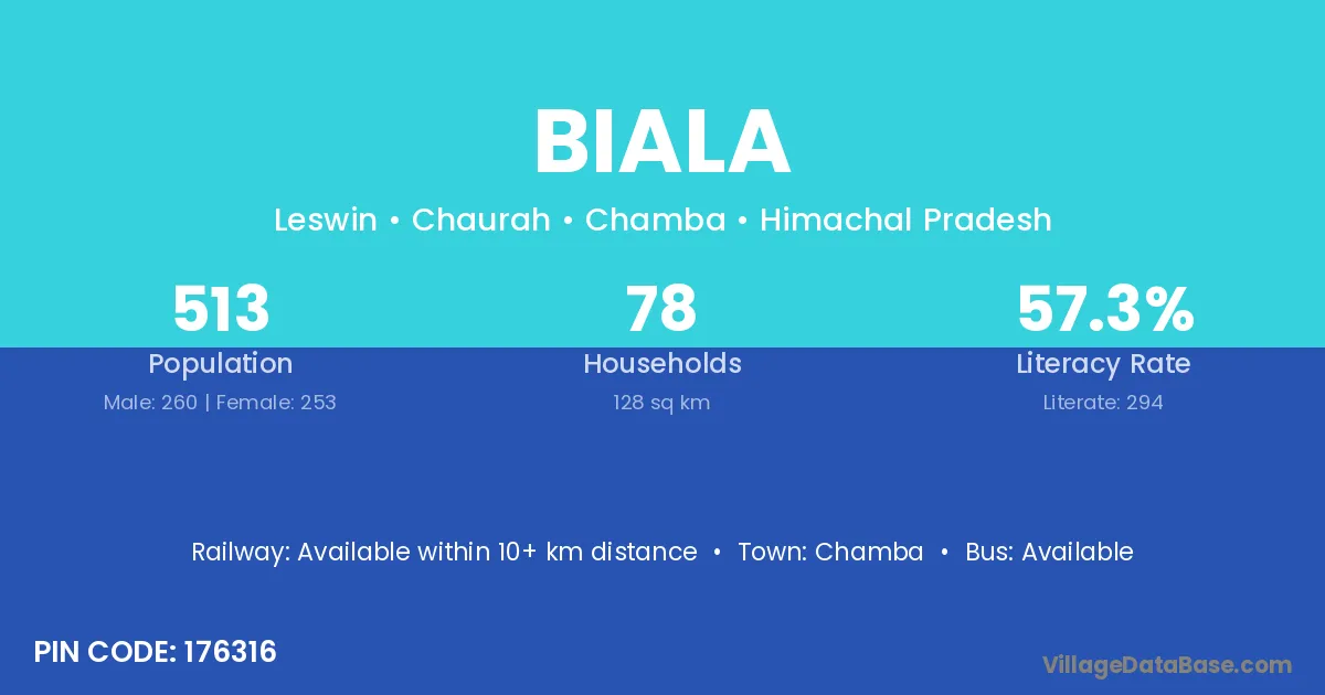 Biala village has a total population of 513 people, of which 260 are males and 253 are females.