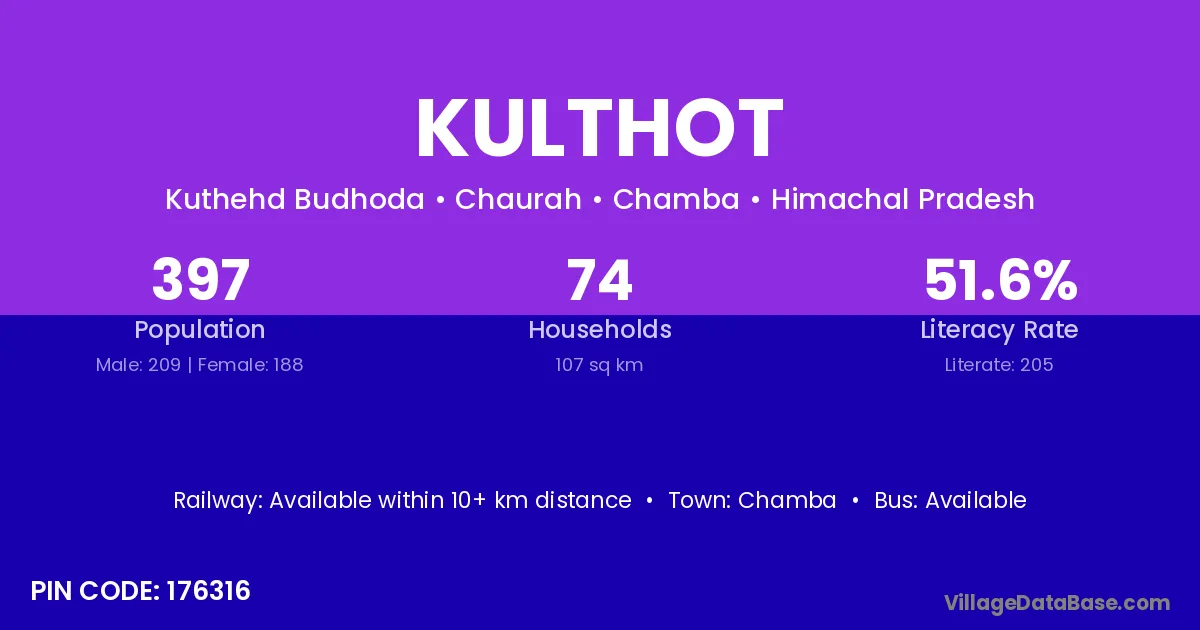 Kulthot village has a total population of 397 people, of which 209 are males and 188 are females.