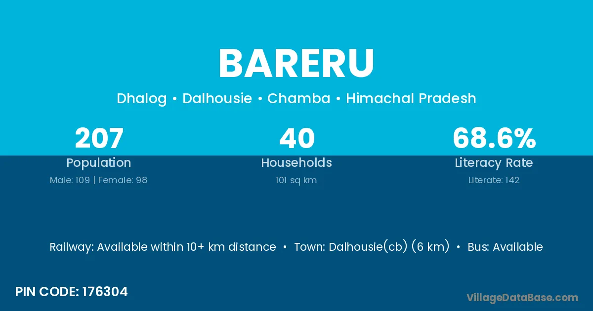 Dalhousie(cb) (6 km) is the nearest town to Bareru village for major economic activities and is located approximately 6 km away.