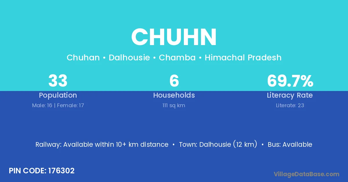 Dalhousie (12 km) is the nearest town to Chuhn village for major economic activities and is located approximately 12 km away.