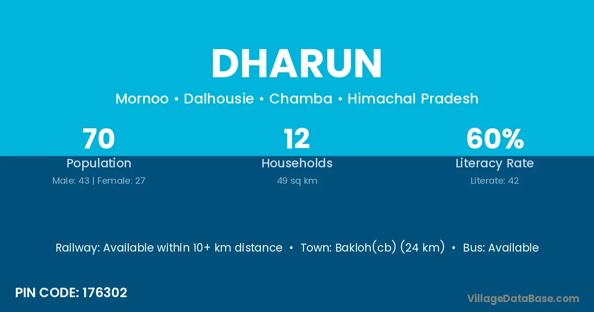 Bakloh(cb) (24 km) is the nearest town to Dharun village for major economic activities and is located approximately 24 km away.