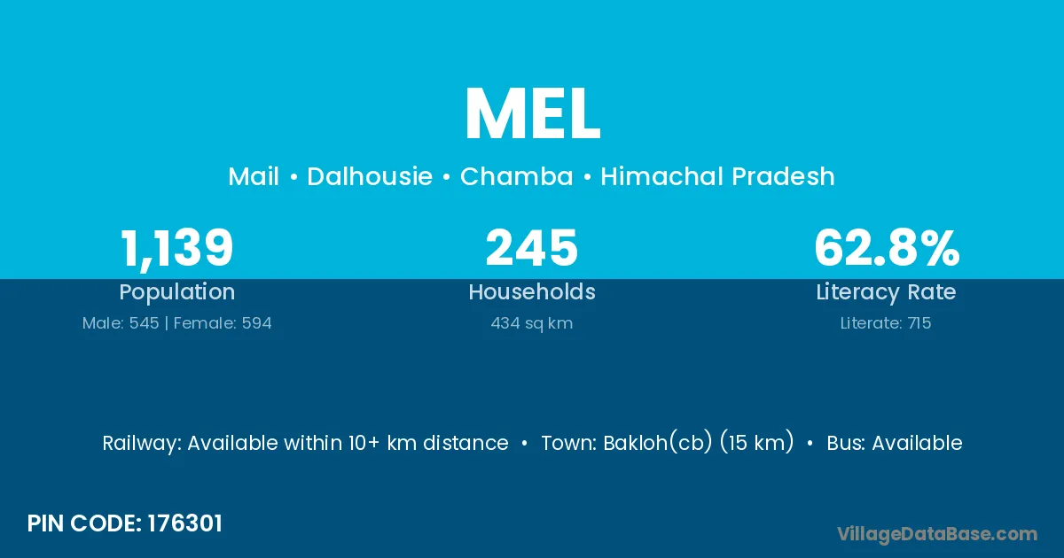 Bakloh(cb) (15 km) is the nearest town to Mel village for major economic activities and is located approximately 15 km away.