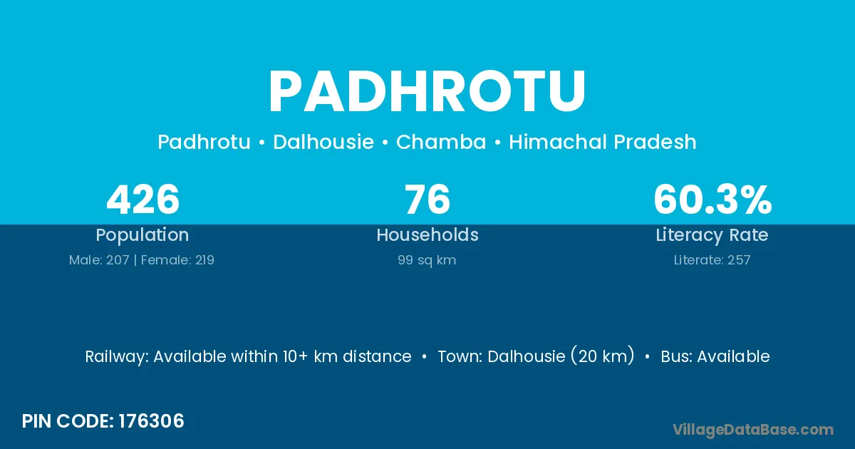 Dalhousie (20 km) is the nearest town to Padhrotu village for major economic activities and is located approximately 20 km away.