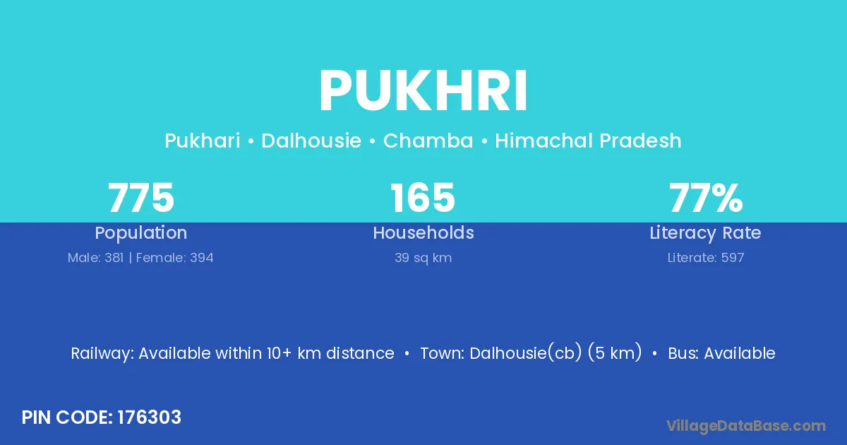 Dalhousie(cb) (5 km) is the nearest town to Pukhri village for major economic activities and is located approximately 5 km away.