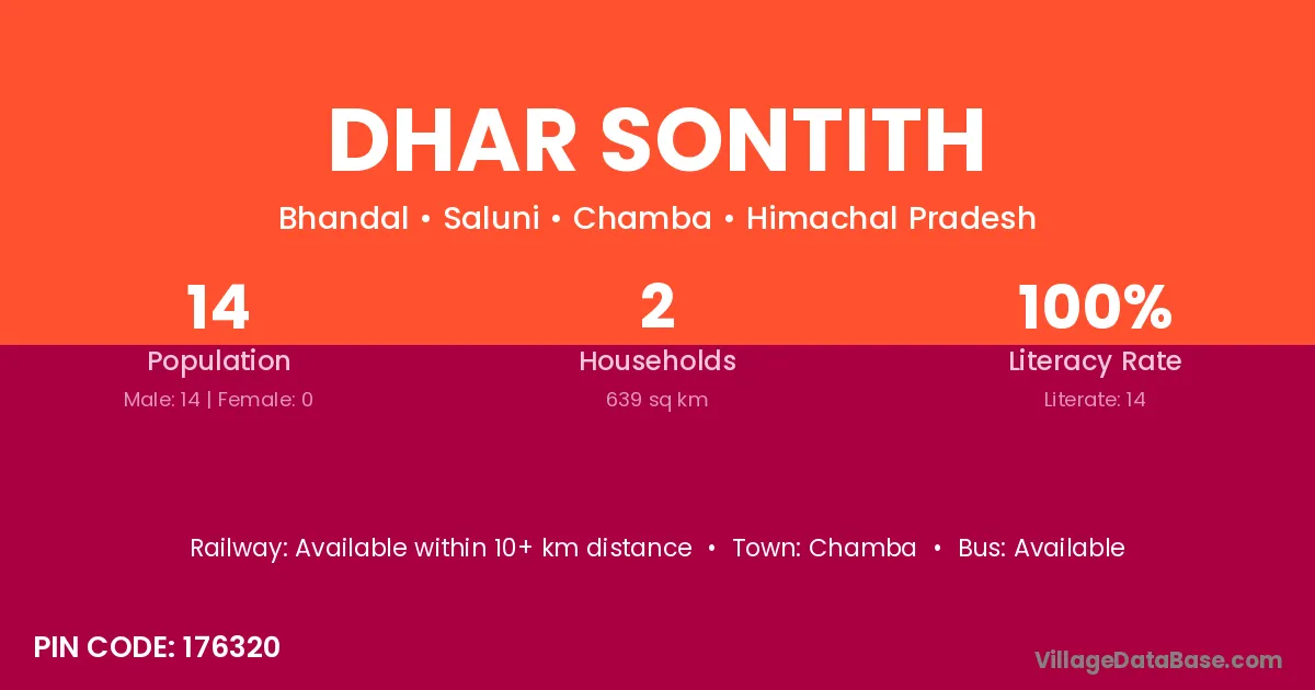 Dhar Sontith village has a total population of 14 people, of which 14 are males and 0 are females.
