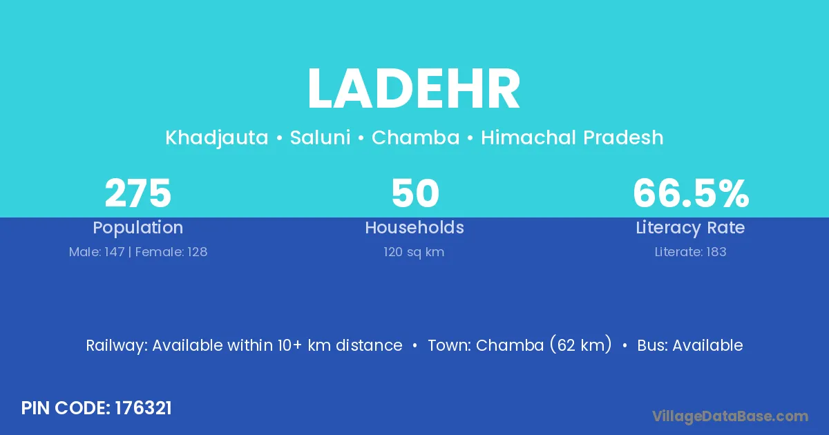 Chamba (62 km) is the nearest town to Ladehr village for major economic activities and is located approximately 62 km away.
