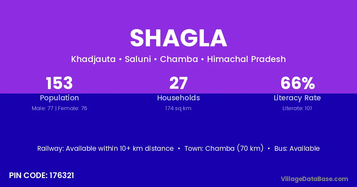 Shagla village has a total population of 153 people, of which 77 are males and 76 are females.