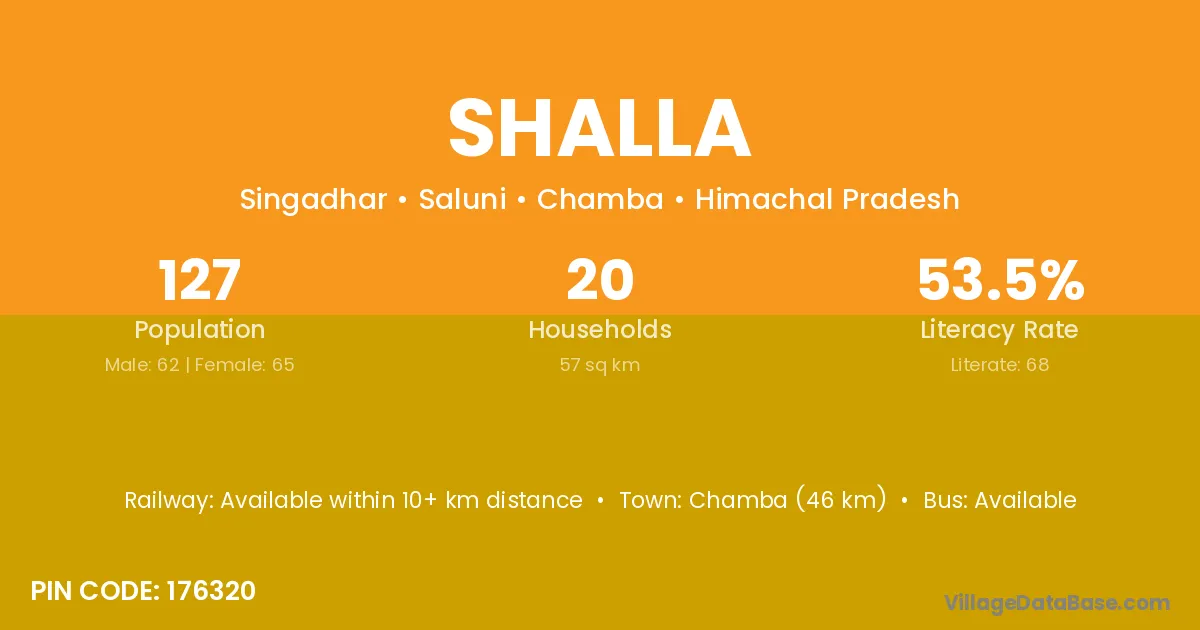 Shalla village has a total population of 127 people, of which 62 are males and 65 are females.