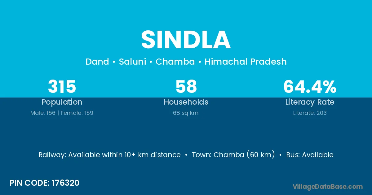 Chamba (60 km) is the nearest town to Sindla village for major economic activities and is located approximately 60 km away.