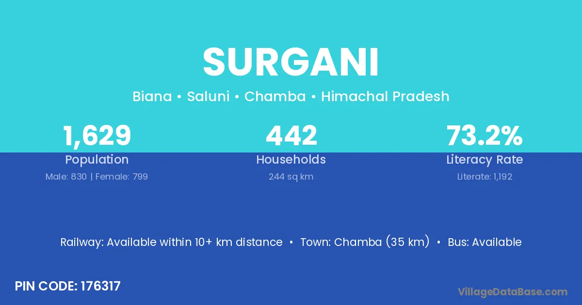 Chamba (35 km) is the nearest town to Surgani village for major economic activities and is located approximately 35 km away.