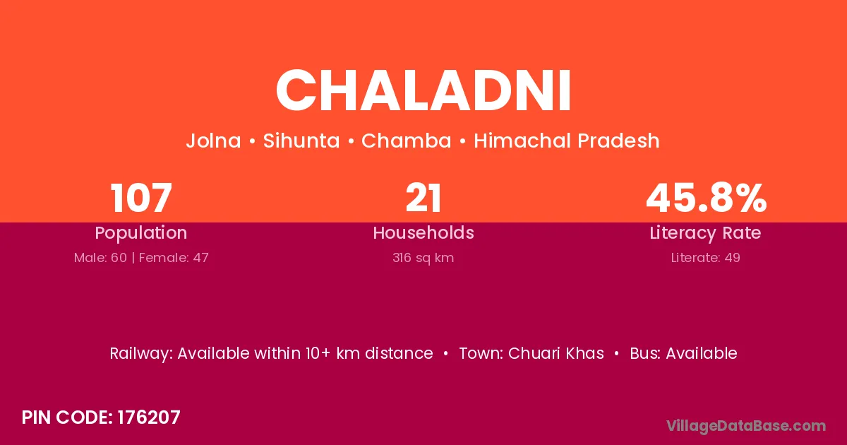 Chaladni village has a total population of 107 people, of which 60 are males and 47 are females.