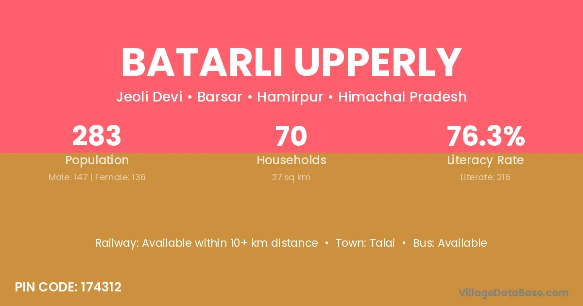 Batarli Upperly village has a total population of 283 people, of which 147 are males and 136 are females.