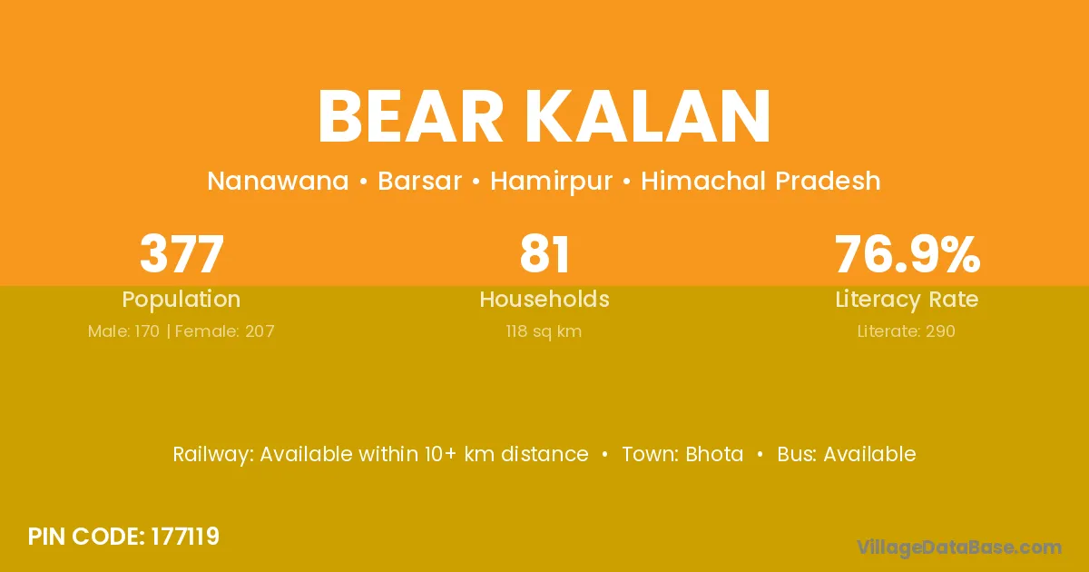 According to Census 2011 information, the village code of Bear Kalan village is 177119.