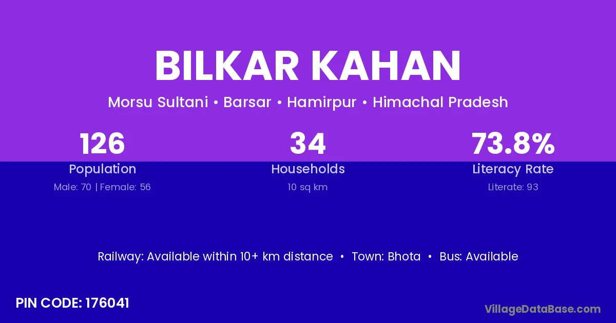 Bilkar Kahan village has a total population of 126 people, of which 70 are males and 56 are females.