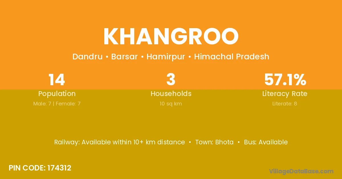 Khangroo village has a total population of 14 people, of which 7 are males and 7 are females.